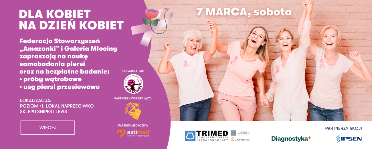 Z okazji Dnia Kobiet, które odbędzie się 7 marca w Galerii Młociny w Warszawie zachęcamy Panie do zadbania o swoje zdrowie poprzez naukę samobadania i profilaktyczne USG piersi, wątroby oraz badania oceniające funkcje wątroby. Chcemy wspólnie budować świadomość, że zdrowie kobiet to zarówno profilaktyka raka piersi, jak i chorób wątroby, do których należy m.in. PBC (pierwotne zapalenie dróg żółciowych), na które najczęściej chorują właśnie kobiety (90% zachorowań wśród kobiet, głównie po 40. roku życia).