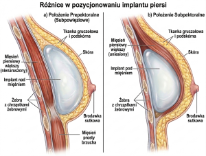 Rycina 2. Różnice między położeniem prepektoralnym a subpektoralnym implantu i ekspandera.