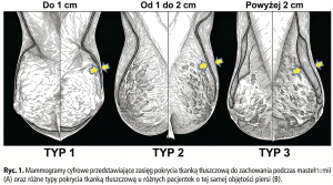 Rycina 3. Różne typy pokrycia tkanką tłuszczową gruczołu piersiowego, istotne przy kwalifikacji do zabiegu rekonstrukcji wyniosłości piersiowej.